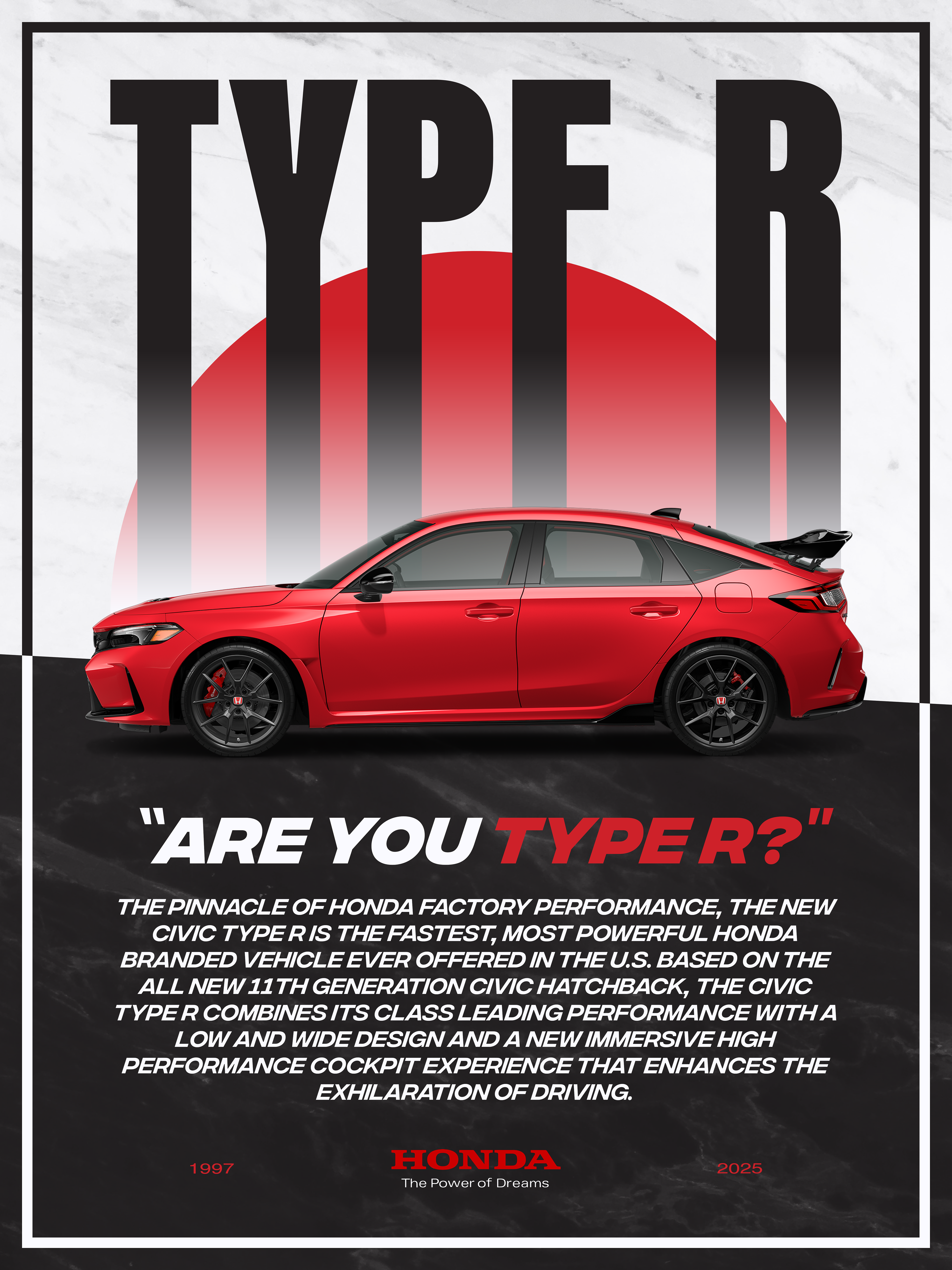 Above is a concept poster for Honda, promoting their Civic Type R. For this project, I tried to combine Honda's existing design style for the Type R's branding with my own style, resulting in a sleek design reminiscent of retro and vintage car promotions.